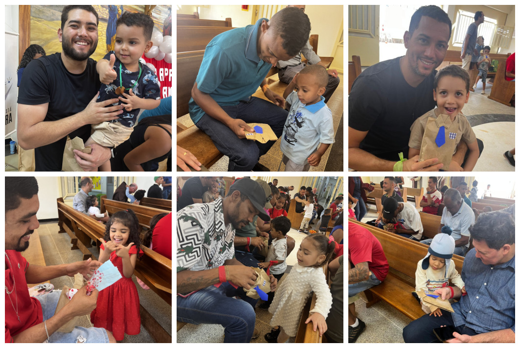 Tivemos brincadeiras entre pais e filhos, evangelização, lanche especial, e claro, aquela linda homenagem dos pequenos aos seus papais – momento de muita canção e emoção! 🥹💙 🎼🎉